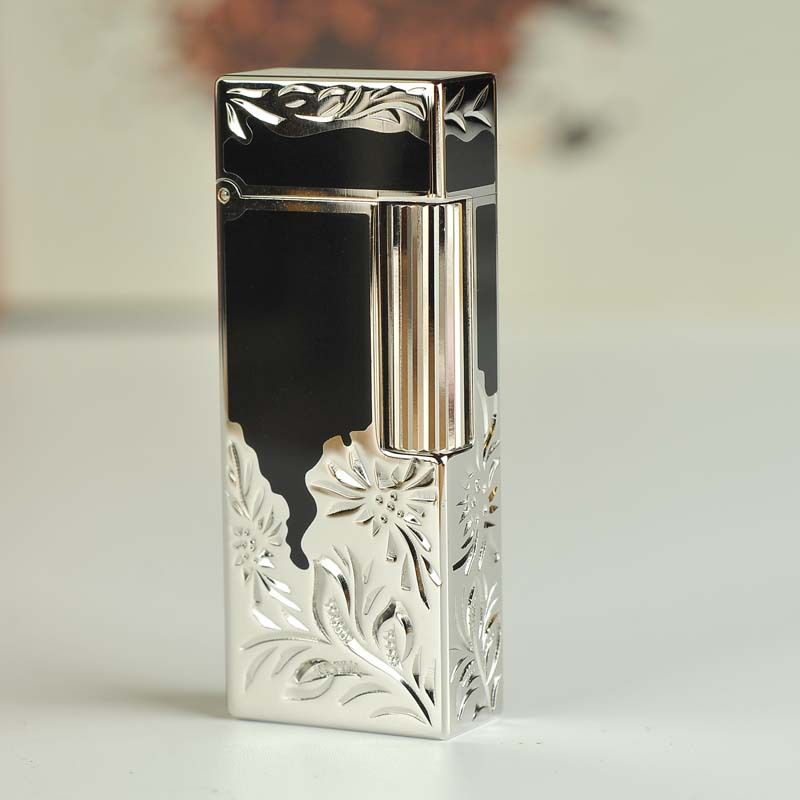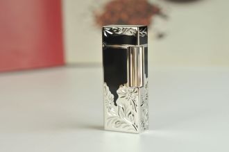 Органічний дизайн: Головний акцент зроблений на контрасті між строгою геометричною формою запальнички та плавними, «живими» лініями квіткового гравіювання. Сріблясті квіти ефектно обрамляють корпус, додаючи йому візуальної легкості.