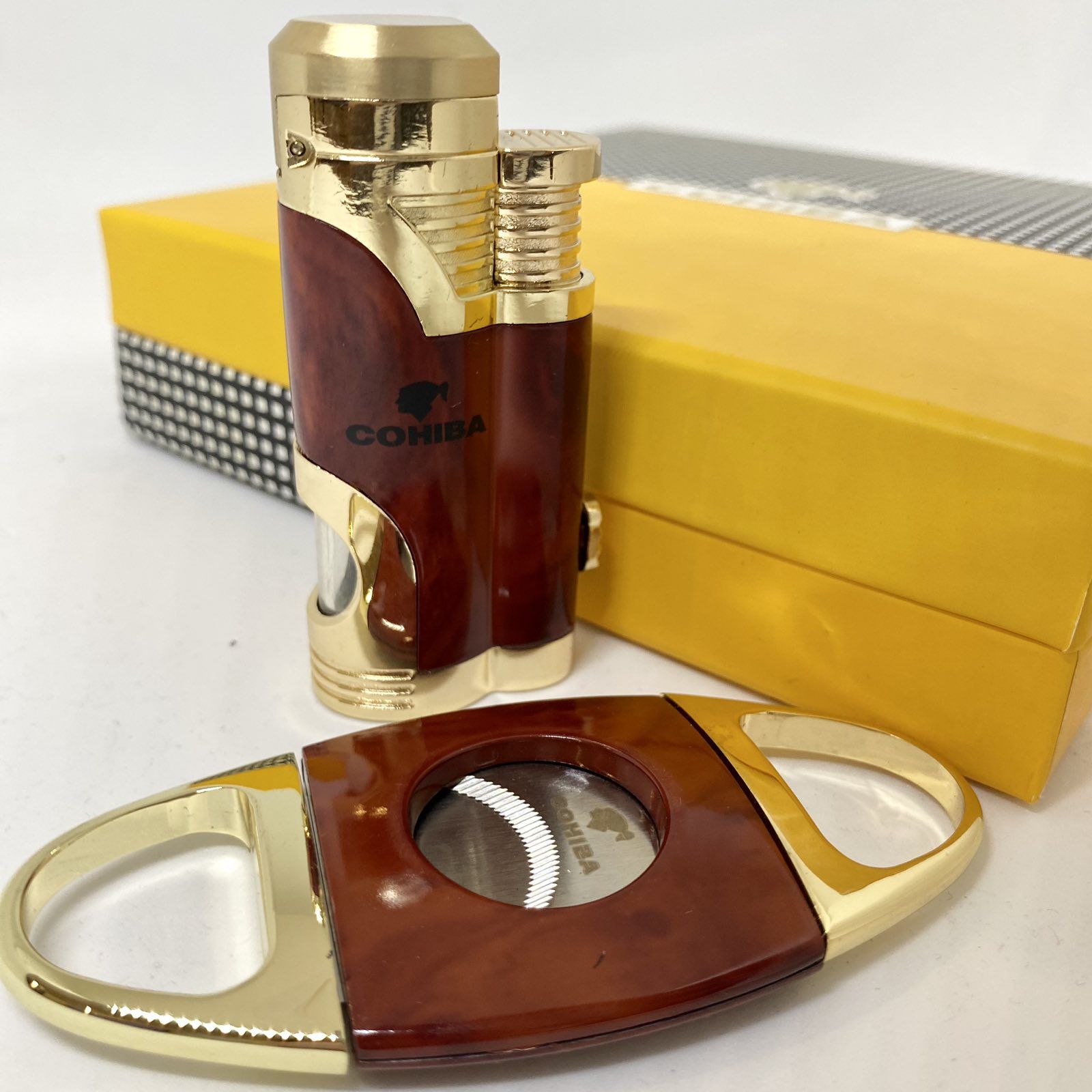 Турбо-запальничка Cohiba та гільйотина коричнево-золотистого кольору у наборі