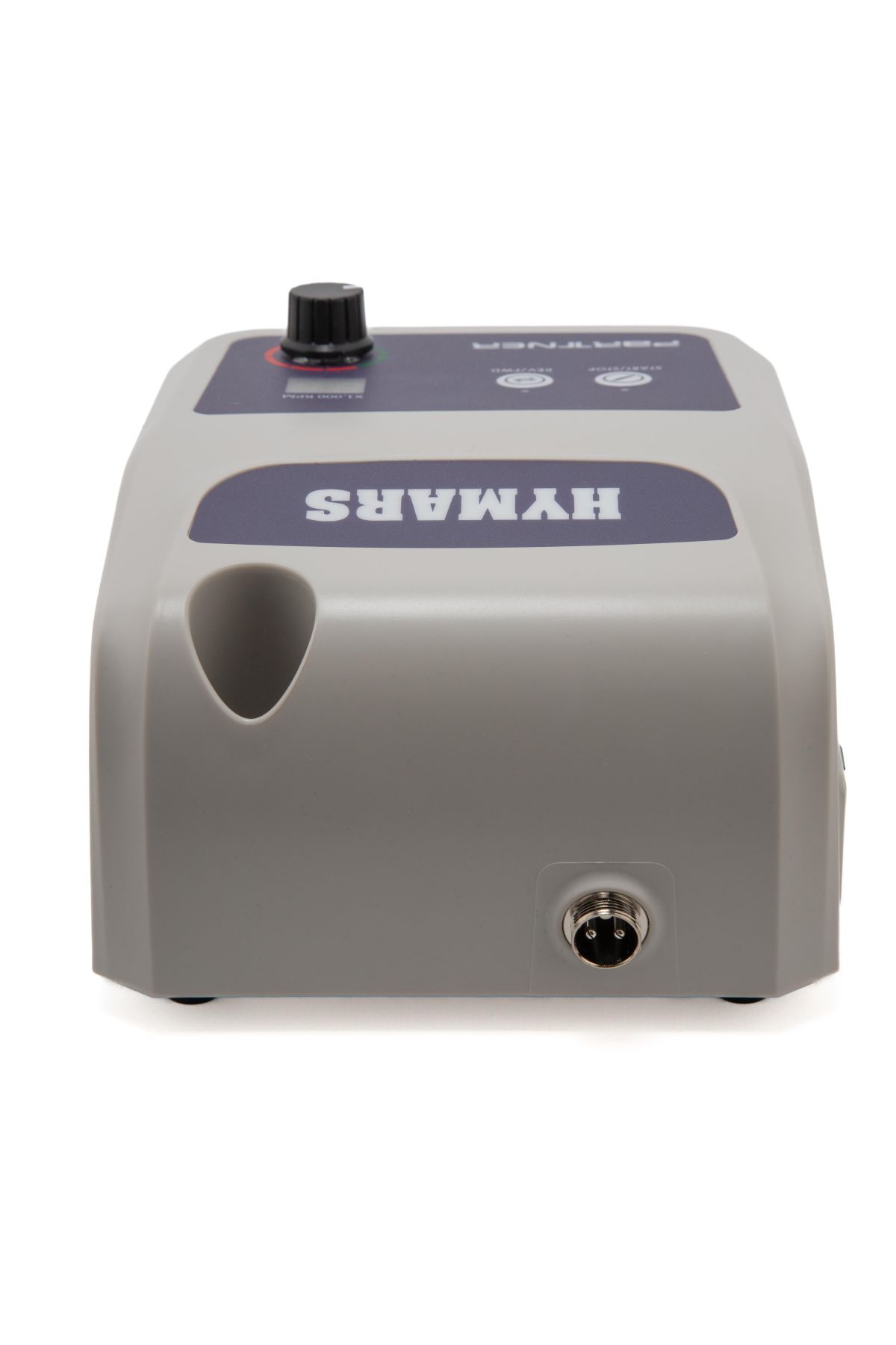 На передней части корпуса расположен разъем для подключения микромотора, сенсорная кнопка "Старт", сенсорная кнопка "Реверс" и регулятор скорости вращения фрезы. Кнопка OFF/ON находится сбоку возле разъема сети. Разъем для подключения ножной педали находится на задней части корпуса.