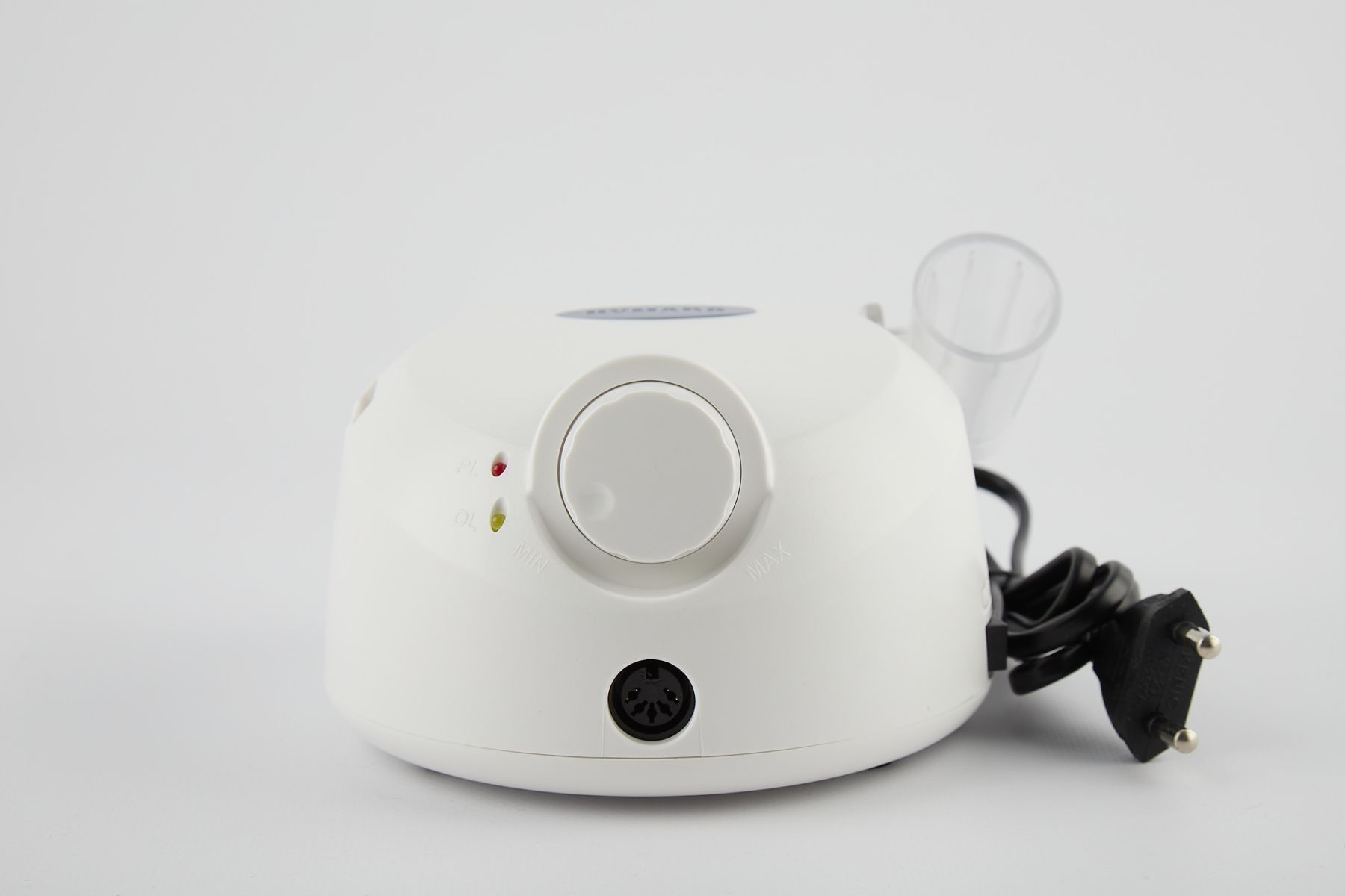 На передней части корпуса расположен разъем для подключения микромотора и регулятор скорости вращения фрезы, рядом с ним находятся две красные и желтые лампочки. Красный означает, что фрезер включен и готов к работе. Желтая лампочка загорается, когда фрезер перегружен и если мастер не обратил на это внимание, через пару секунд фрезер отключится. После перезагрузки устройства (выключить и включить) вы сможете продолжить работу.