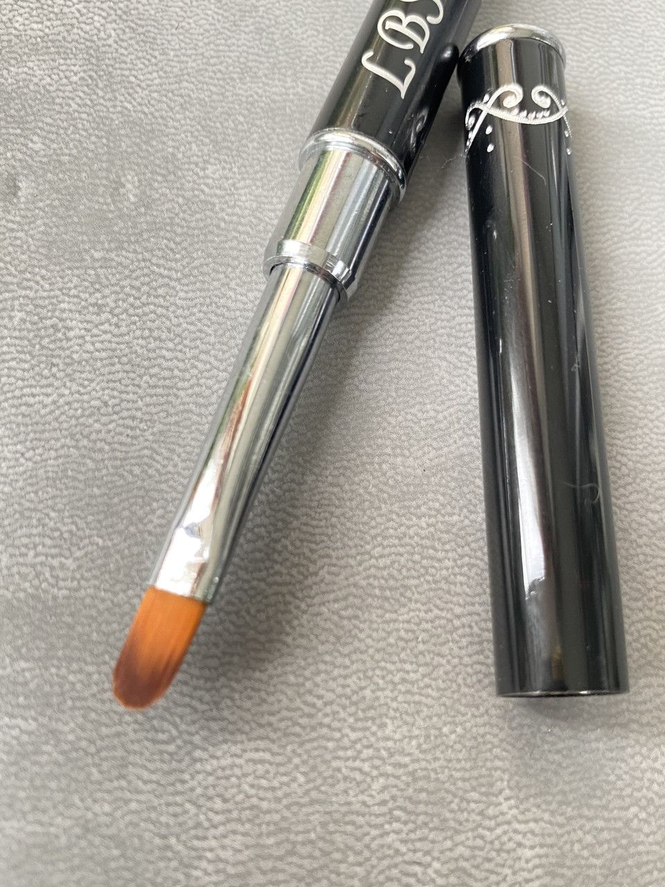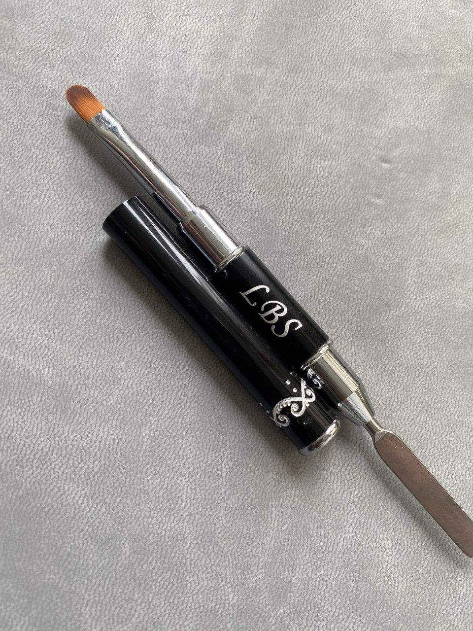 Двосторонній пензлик-шпатель LBS для полігеля - з одного боку шпатель, який допомагає відокремити полігель при видавлюванні з тюбика, а з іншого боку знаходиться плоска кисть, яка дозволяє моделювати ніготь полігелем (акрігелем).