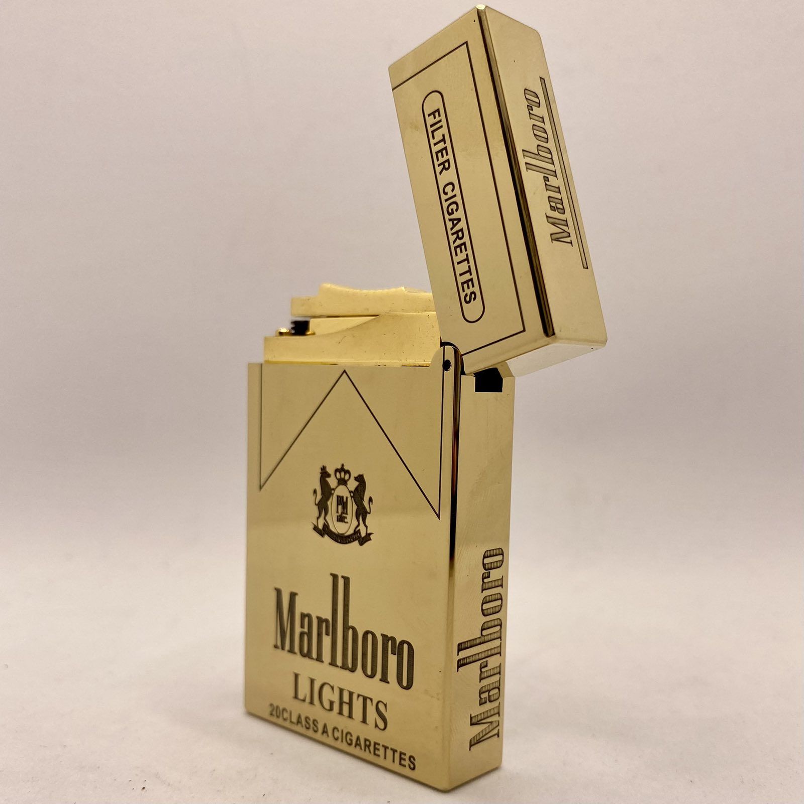 Ця запальничка є втіленням стилю та функціональності. Виготовлена з високоякісного металу із розкішним золотим покриттям, вона майстерно імітує культову пачку сигарет Marlboro Lights, додаючи шарму та вінтажного шику вашому образу.