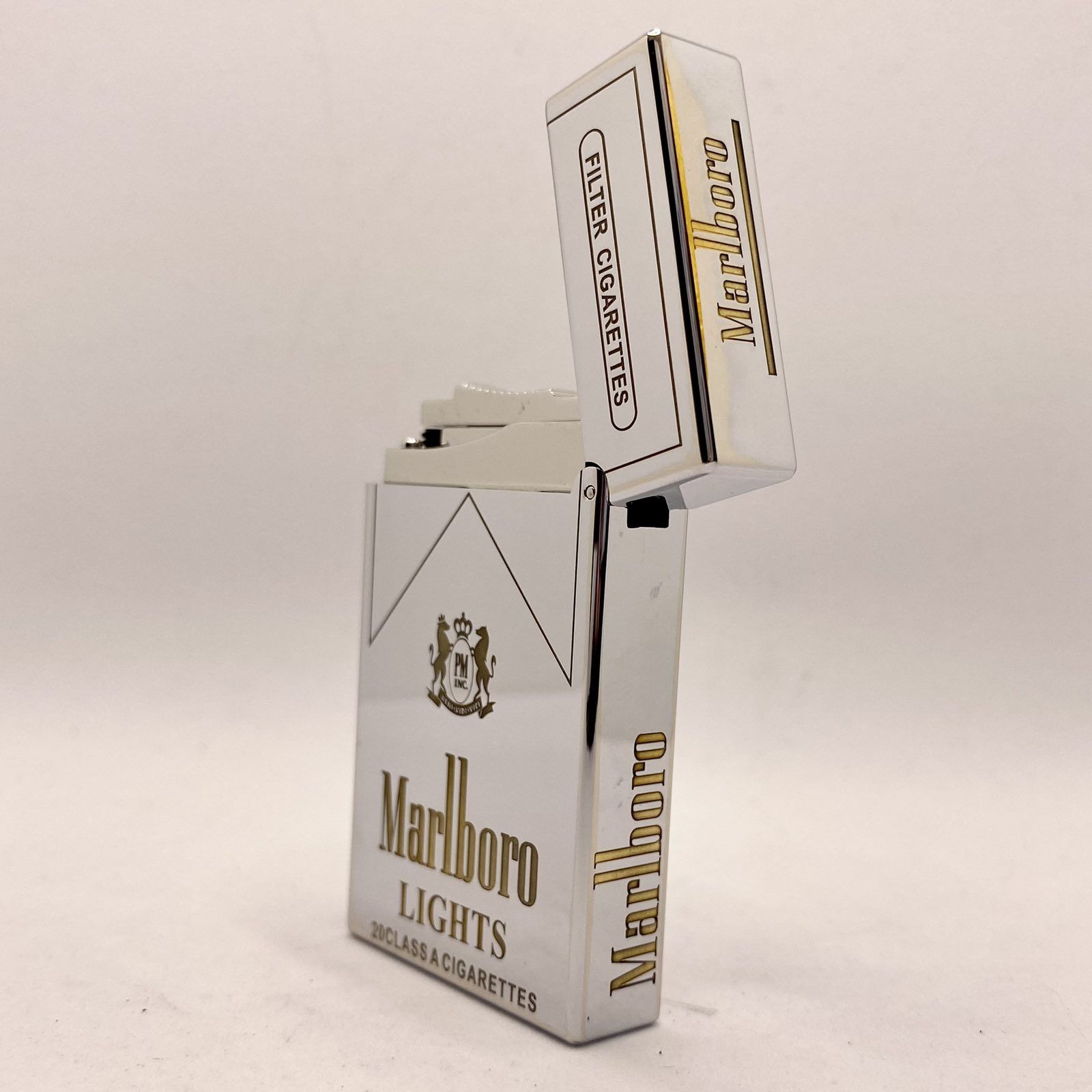 Ця запальничка — не просто джерело вогню, а стильний аксесуар, виконаний у формі класичної пачки сигарет (Marlboro Lights), що робить її ідеальним подарунком та предметом колекції.