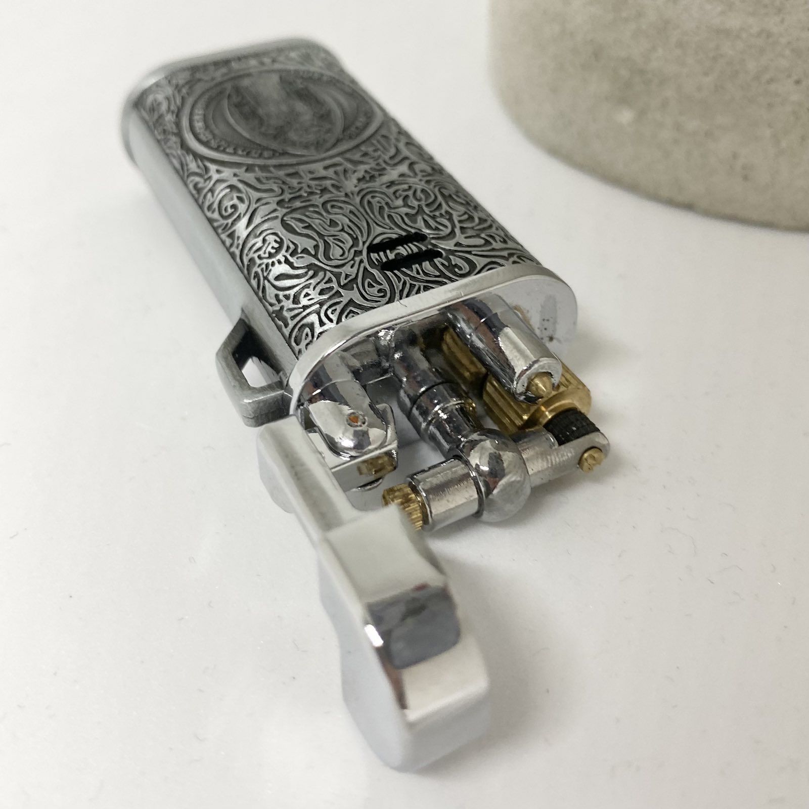 Класична механіка: Традиційний кремнієвий підпал забезпечує стабільне полум'я та приємне тактильне відчуття під час використання. Золотисті елементи механізму додають яскравого акценту та підкреслюють статусність речі.