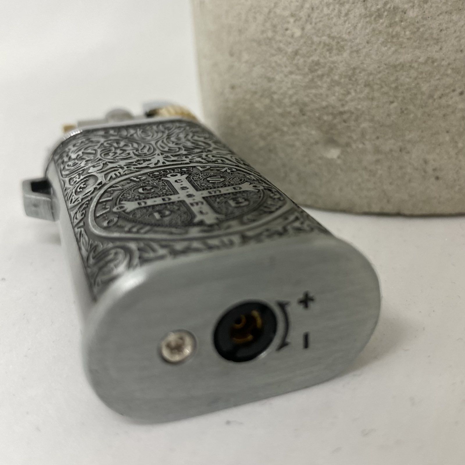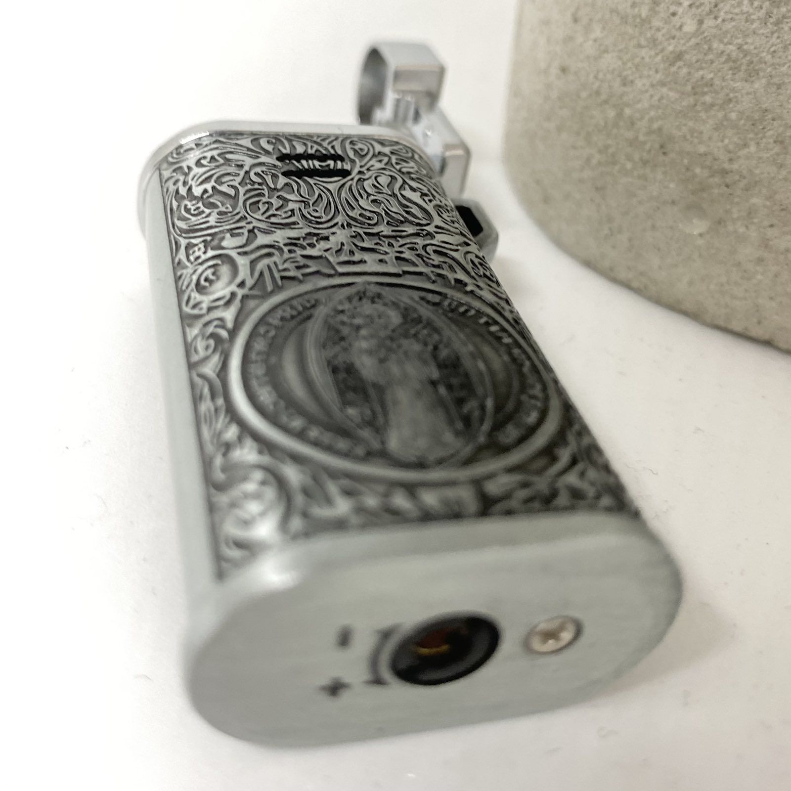 Ексклюзивний дизайн: Корпус прикрашений детальним рельєфним гравіюванням із зображенням Медальйона Святого Бенедикта та витонченими бароковими візерунками. Покриття "античне срібло" надає виробу благородного вигляду з ефектом старовини.