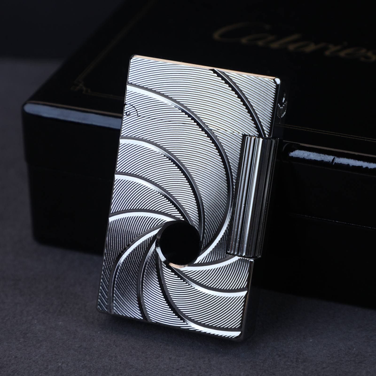 Захоплюючий дизайн: Головна особливість цієї запальнички – її унікальний рельєфний візерунок, натхненний легендарною заставкою "Гармата Джеймса Бонда" або "дуло пістолета". Спіральні лінії, що сходяться до центру, створюють гіпнотичний ефект глибини та руху, надаючи аксесуару динамічності та загадковості. Срібний колір корпусу підсилює елегантність візерунка, роблячи його ще виразнішим та шляхетнішим.