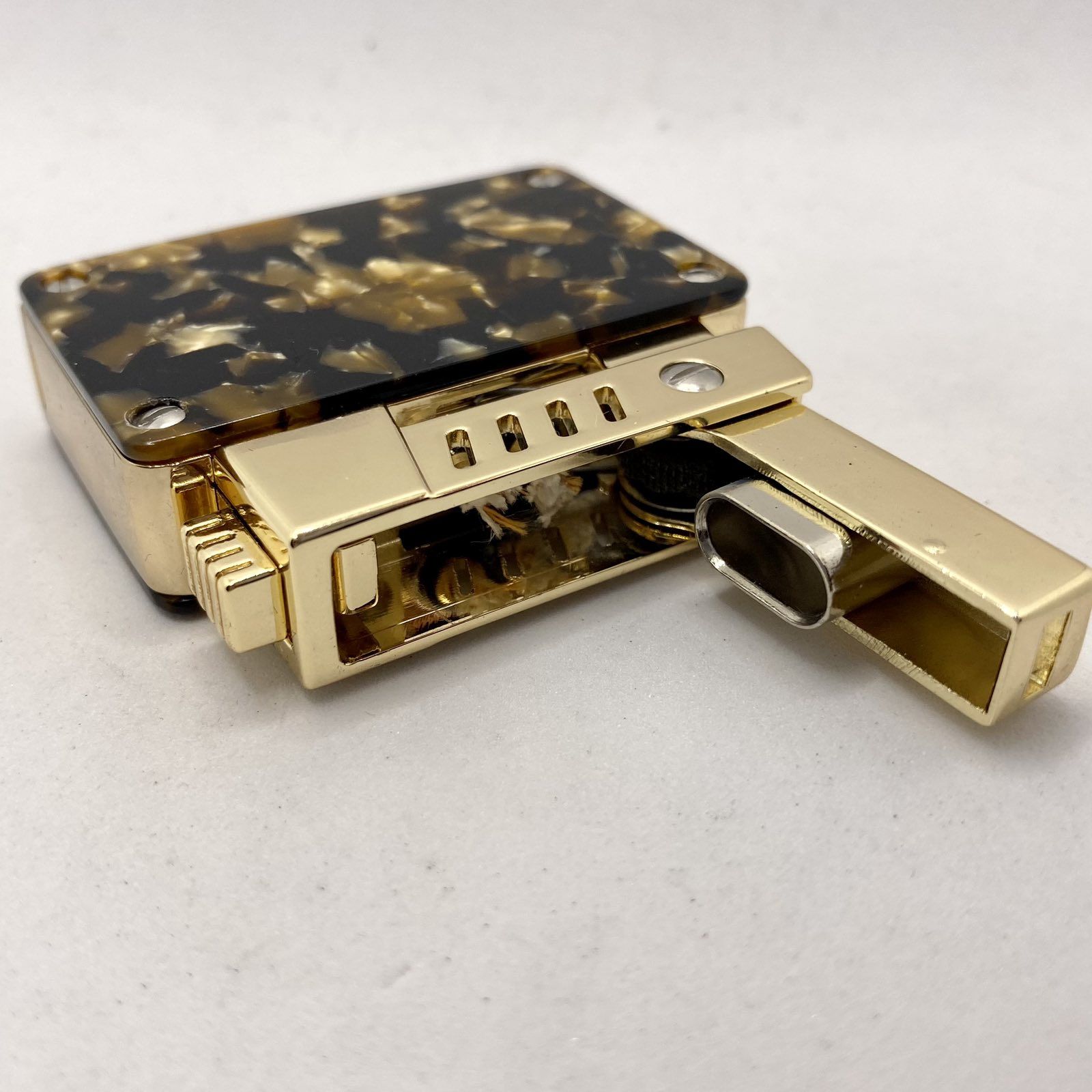 Дизайнерський Дует: Корпус виконаний у вигляді гармонійного поєднання дзеркального золотистого металу та декоративної вставки "Тортойз" (Tortoiseshell). Цей візерунок, що імітує благородний черепаховий панцир, виглядає глибоко, багато та переливчасто.