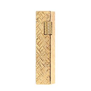 Корпус виконаний у формі стриманого прямокутника, прикрашеного складним, глибоким текстуруванням, що нагадує ювелірну роботу. Яскраве золотисте покриття надає виробу преміального вигляду, а фактурна поверхня гарантує, що запальничка не вислизне з рук.