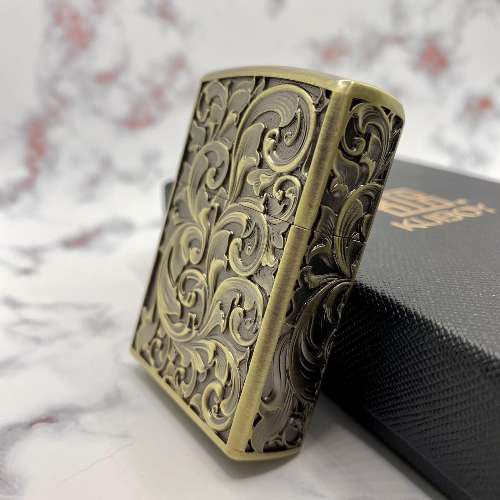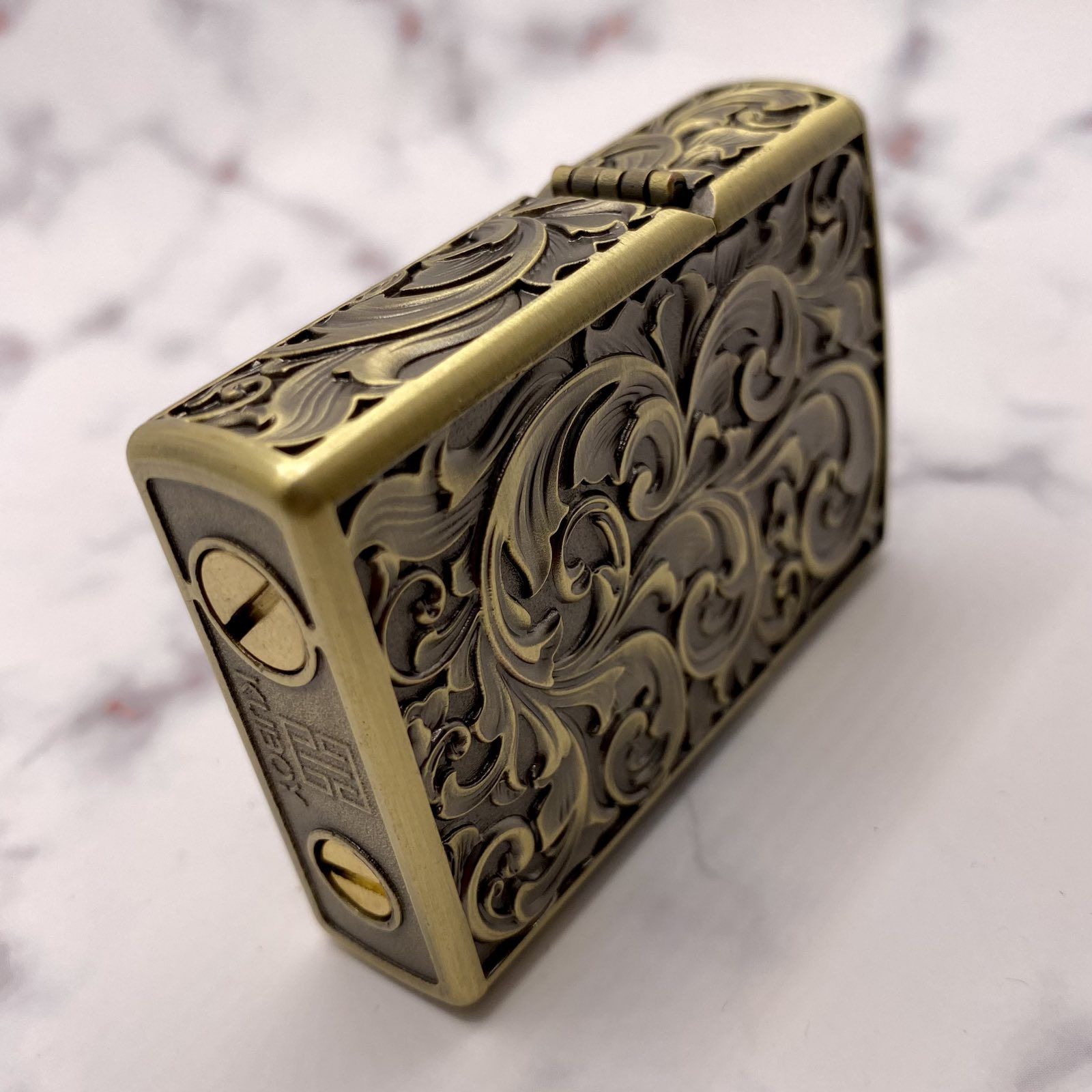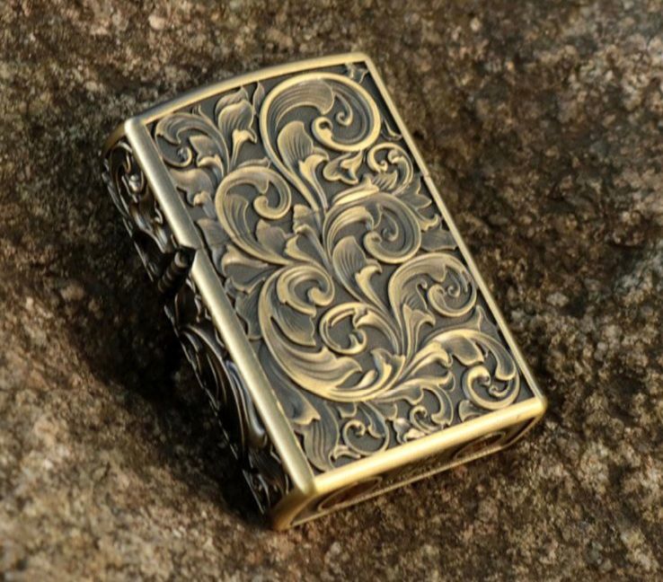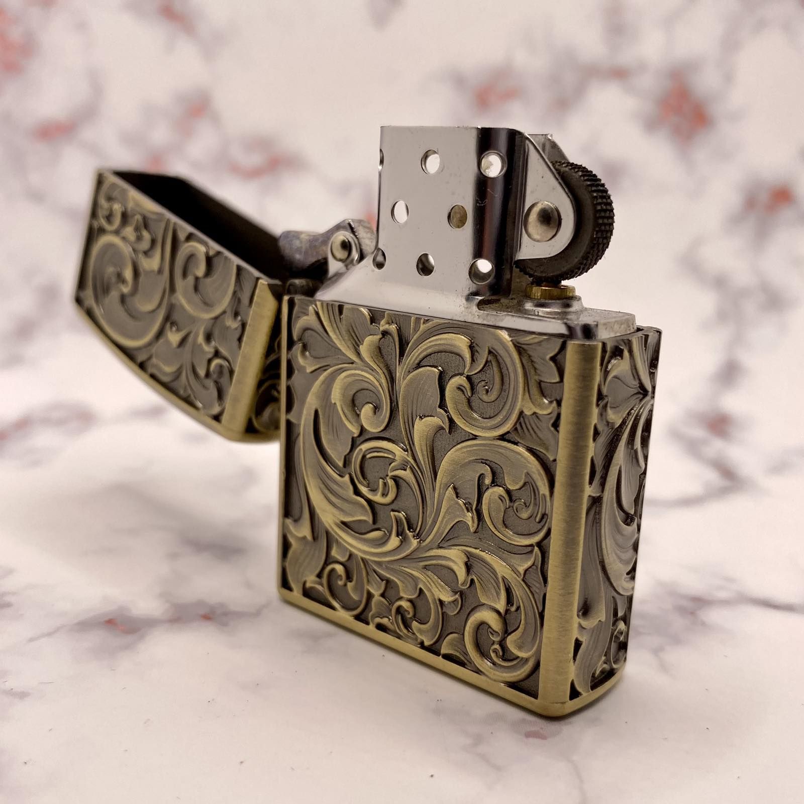 Антична Майстерність: Корпус прикрашений глибоким, насиченим гравіюванням, що імітує барокові візерунки. Матова, "зістарена" поверхня у відтінках бронзи або античної латуні надає запальничці вигляд дорогої сімейної реліквії.