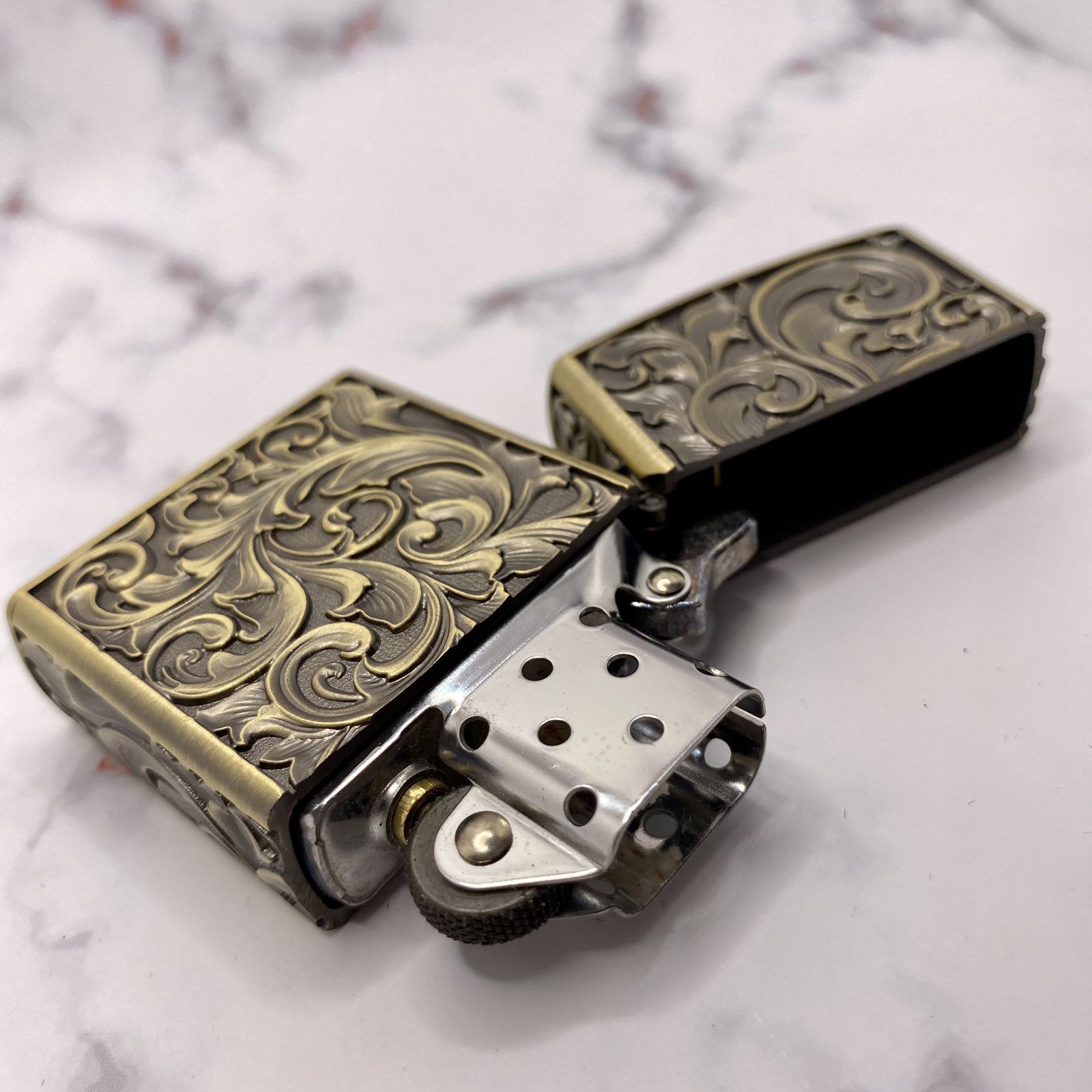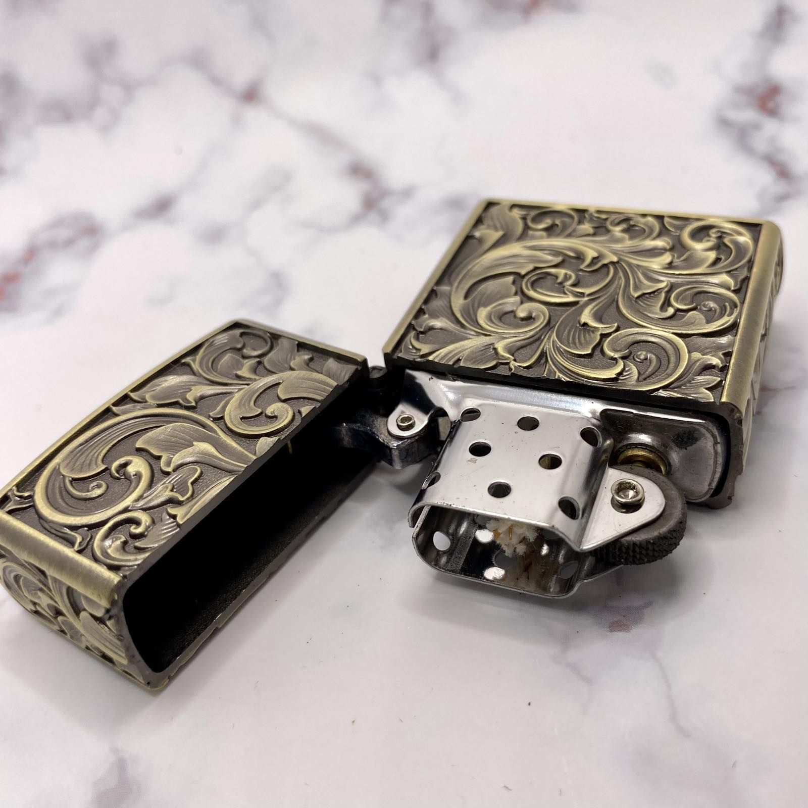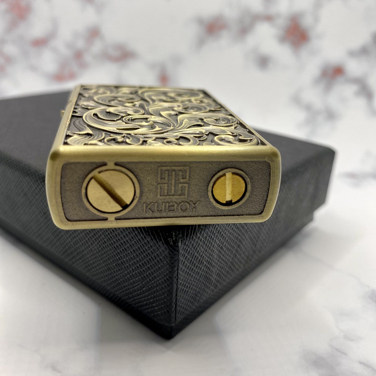 Антична Майстерність: Корпус прикрашений глибоким, насиченим гравіюванням, що імітує барокові візерунки. Матова, "зістарена" поверхня у відтінках бронзи або античної латуні надає запальничці вигляд дорогої сімейної реліквії.