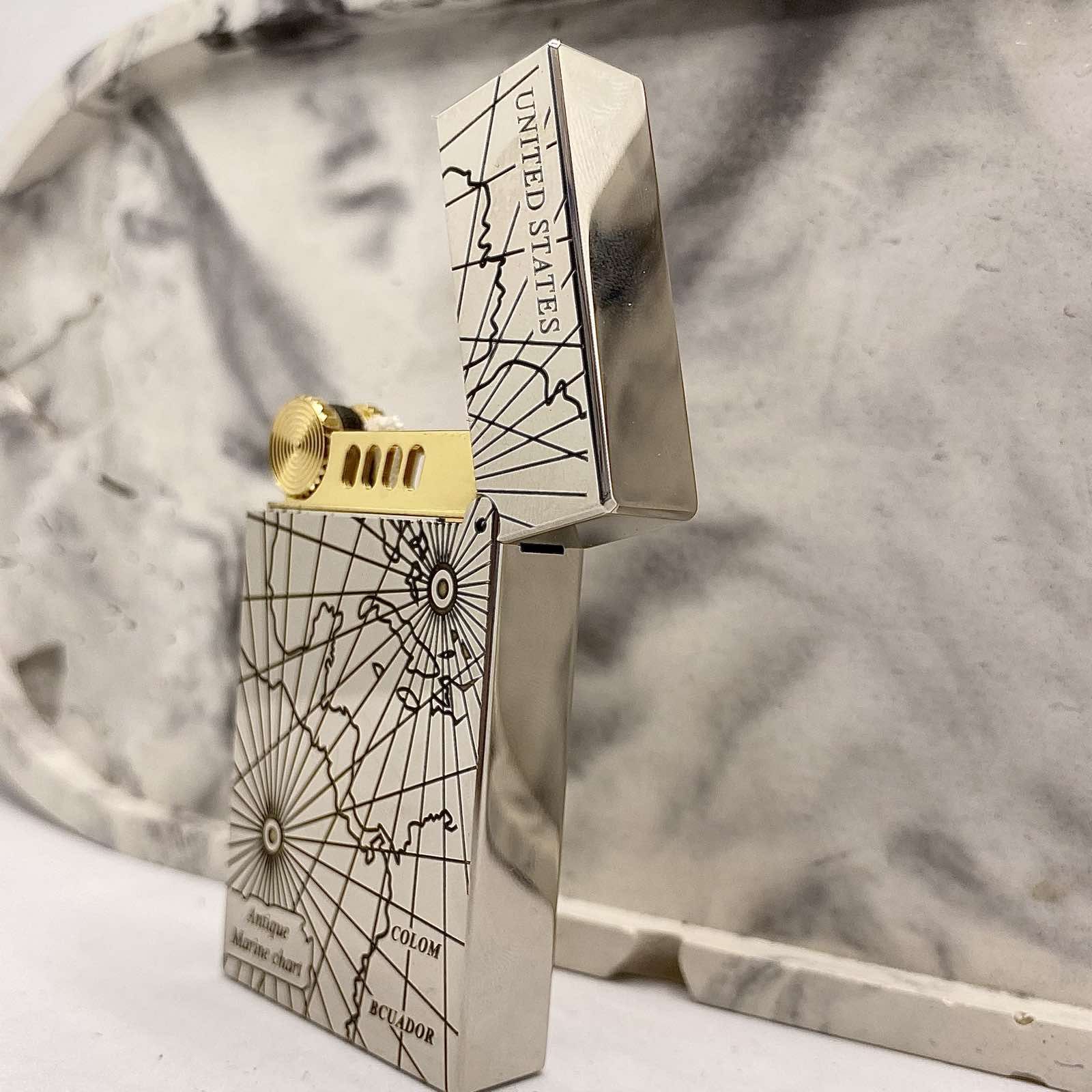 Навігаційний Стиль: Лицьова сторона запальнички прикрашена складним, глибоким гравіюванням у формі Троянди Вітрів (компасного диска) з детальною вимірювальною шкалою.