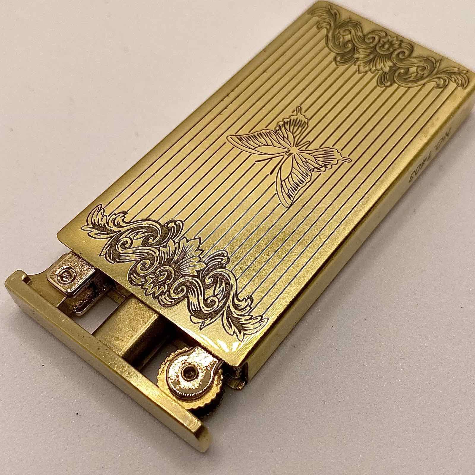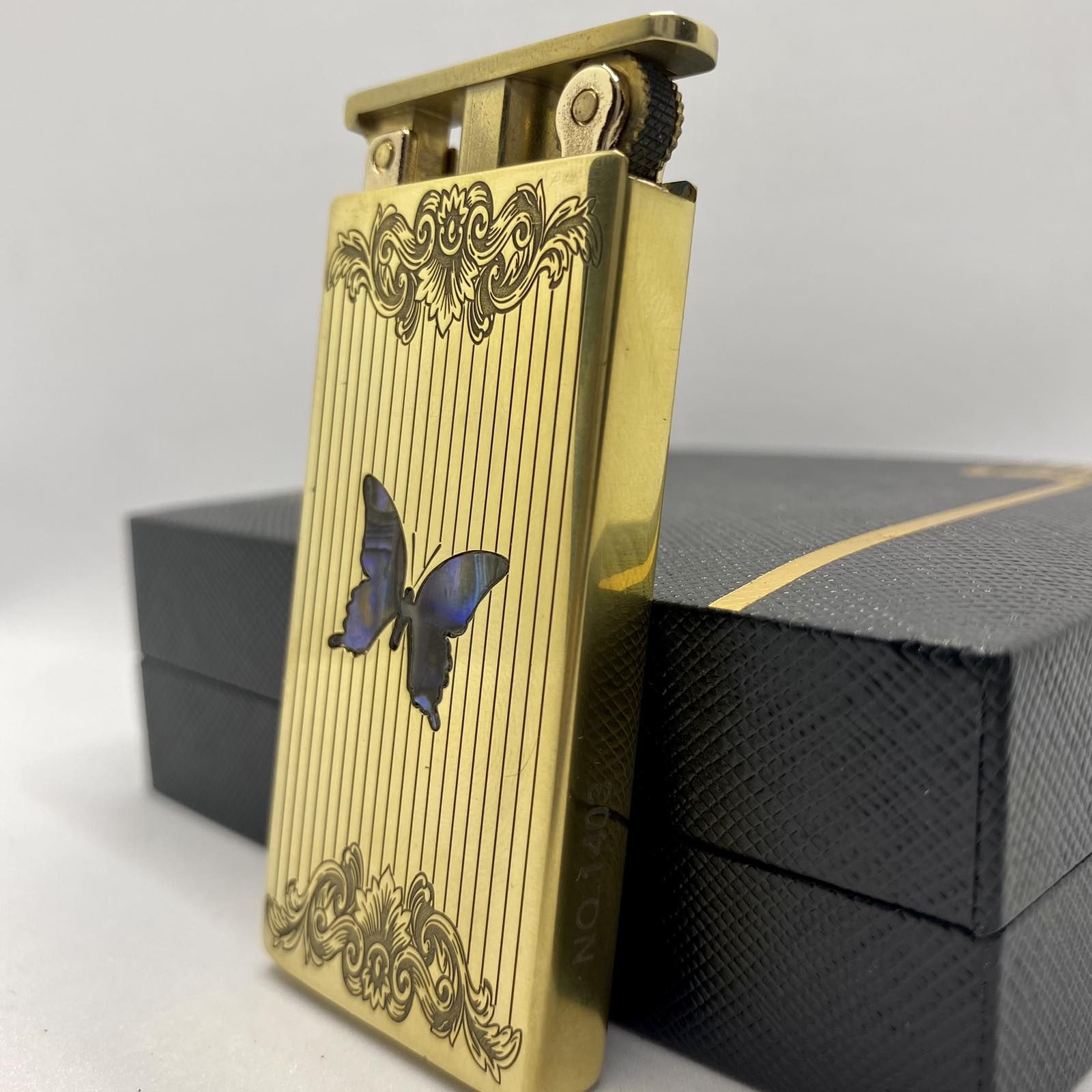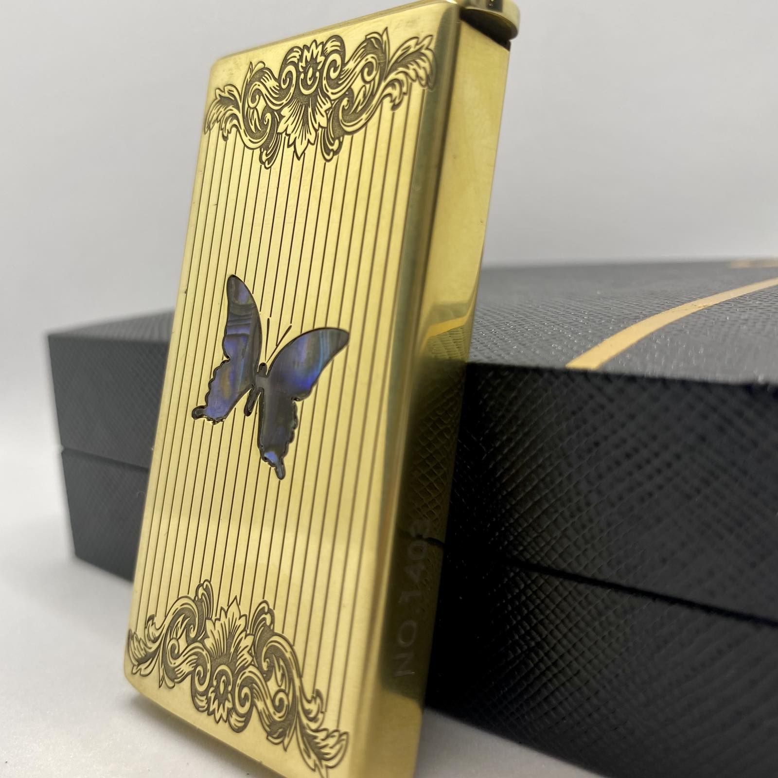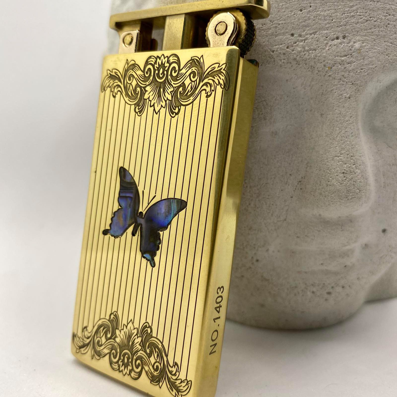 Головний Акцент: У центрі композиції — витончена інкрустація у формі метелика, виконана з переливчастого матеріалу, що імітує перламутр (або морську мушлю). Кожен рух запальнички змушує крила метелика сяяти різними відтінками, створюючи ефект "живого" декору.