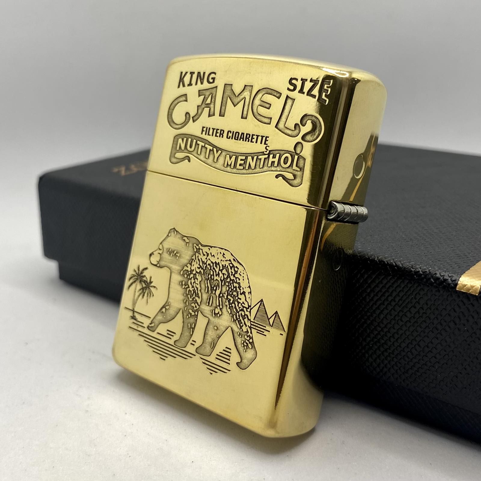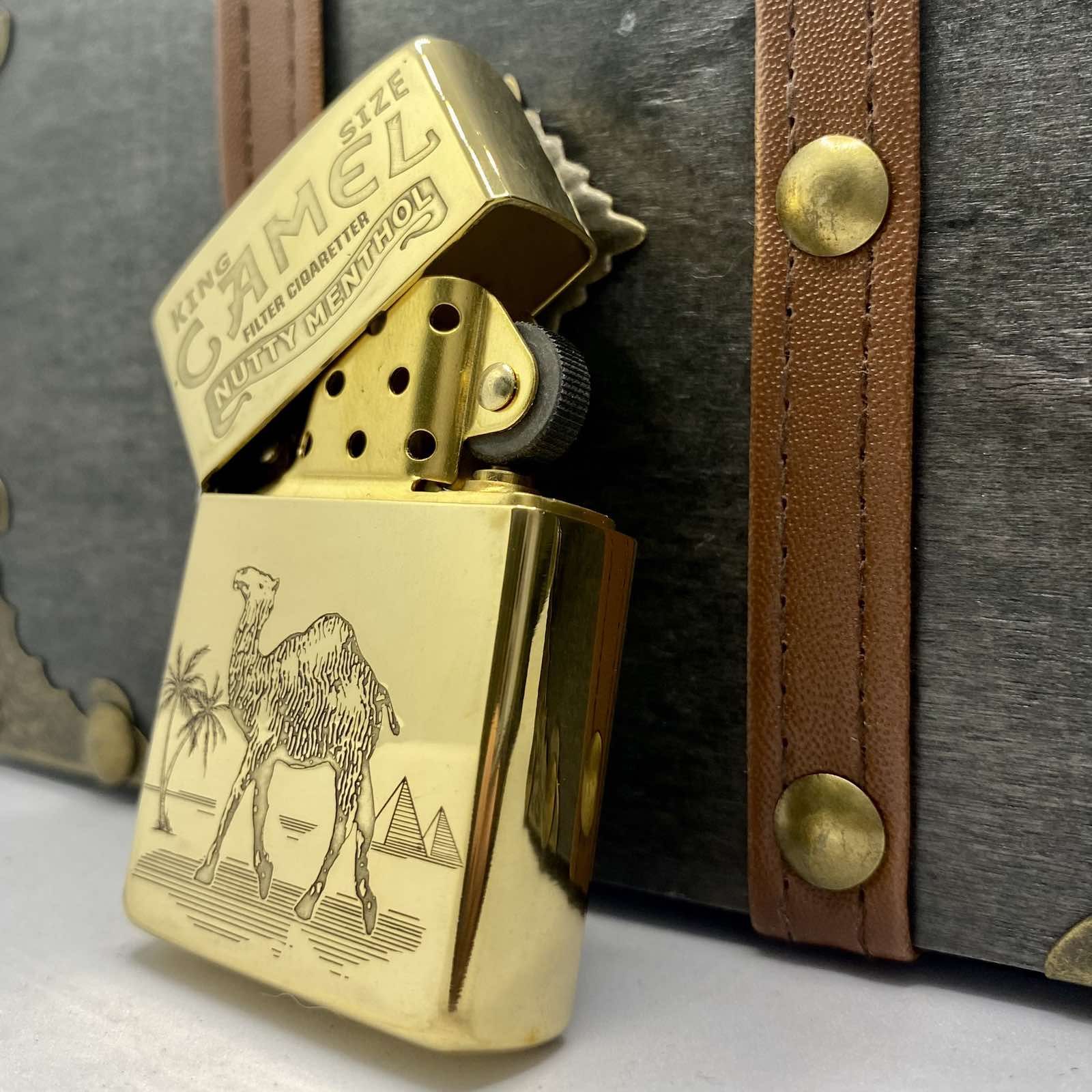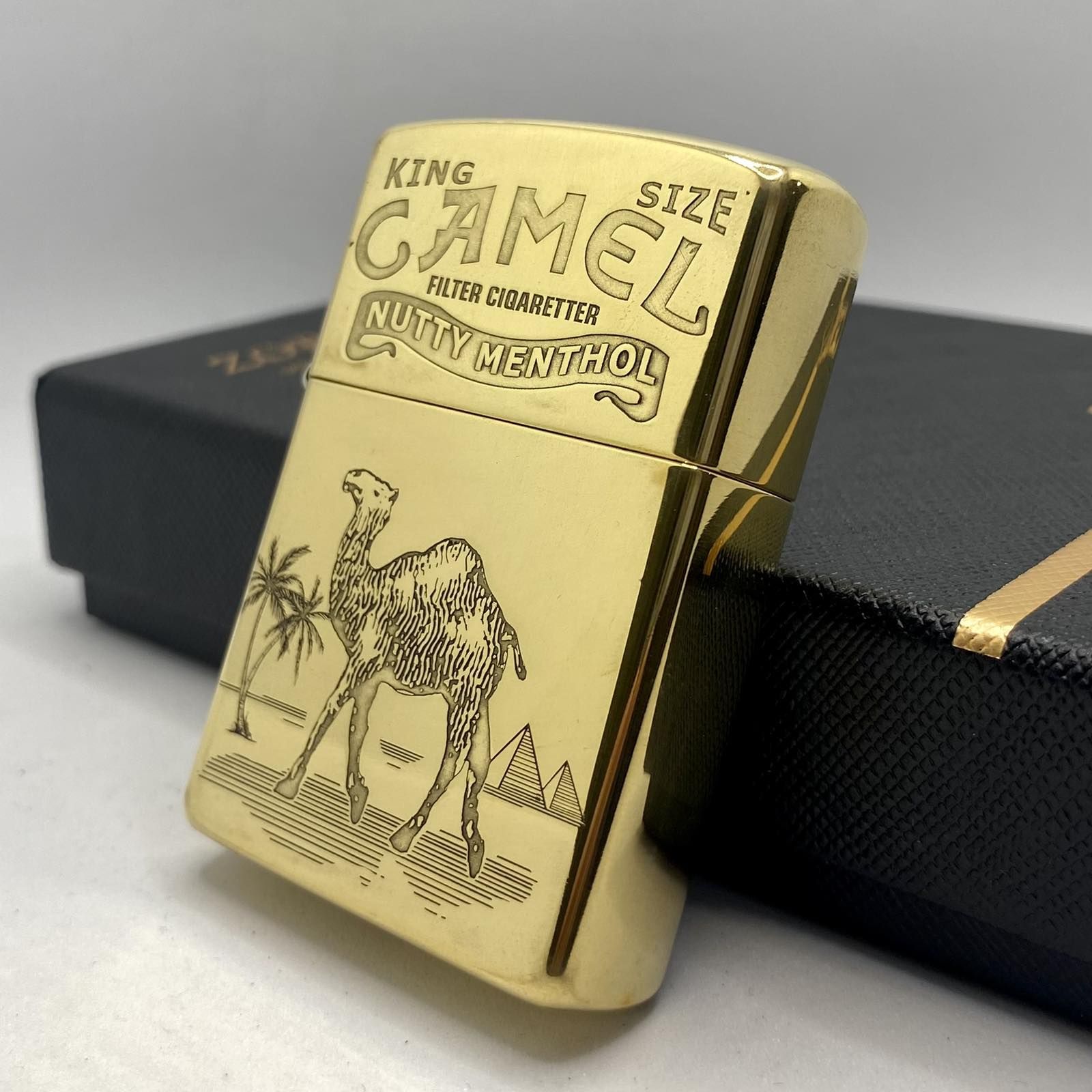 Текст-Легенда: Вгорі нанесено гравіювання "KING SIZE CAMEL FILTER CIGARETTER NUTTY MENTHOL", що додає виробу вінтажного, рідкісного шарму.