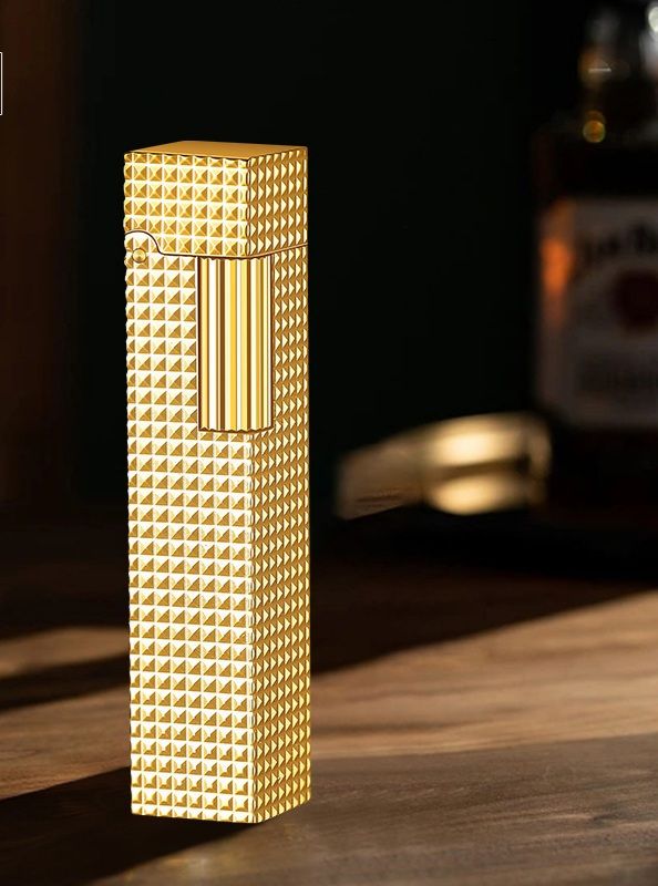 Блиск Золота та Геометрія Розкоші: Корпус запальнички виконаний у блискучому золотому кольорі та повністю покритий унікальним, рельєфним візерунком "Римська клітка" або "Діамантова огранка". Ця складна фактура не лише ефектно виблискує при світлі, але й забезпечує ідеальну ергономіку.